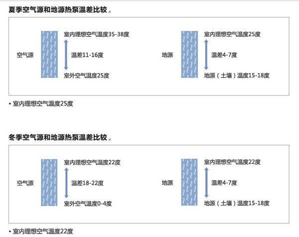 地源熱泵是利用地球表面淺層水源(如地下水、河流和湖泊)和土壤源中吸收的太陽能和地?zé)崮?,并采用熱泵原理,既可供熱又可制冷的高效?jié)能空調(diào)系統(tǒng)。相對于普通空調(diào)(空氣源熱泵)而言,地源熱泵是一種新技術(shù),簡單地說即將普通空調(diào)的換熱源改到土壤或自然水中,也就是夏天將室內(nèi)的熱量送到土壤或自然水中,而冬天從土壤或自然水中提取熱量到室內(nèi)。土壤或自然水的溫度無論冬夏恒定在15-20℃左右,而空氣溫度因冬夏或白天夜晚變化很大,從2-40℃左右,換熱源溫差很大,導(dǎo)致COP值波動很大,能耗極高甚至無法工作。