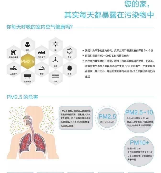 愛迪士新風提供的新風系統是有效應對空氣污染,提升居家生活健康水平的利器。據有關調查顯示,現代人有平均60%~90%的時間在室內。可想而知,如此長時間待在室內環(huán)境里,良好的室內空氣品質對個人健康顯得多么重要。而為了打造良好的室內空氣環(huán)境,應對室外空氣污染對室內空氣的侵襲,以及室內設施帶來的空氣污染,如PM2.5、甲醛、苯、TVOC以及室內塵螨、細菌等,便需要用新風系統把受污染的空氣進行過濾、凈化,最終轉換成新鮮健康的空氣。